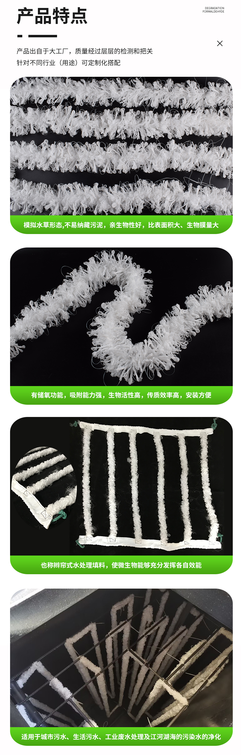 辮帶式水處理填料是新一代環(huán)保型生物活性填料,模擬天然水草形態(tài),不易納藏污泥,充氧時管狀直徑具有可變性,無堵塞;具有親水、親油、對氣泡有很好的切割作用,有儲氧功能,吸附能力強;同時由于受水流和氣流的沖動