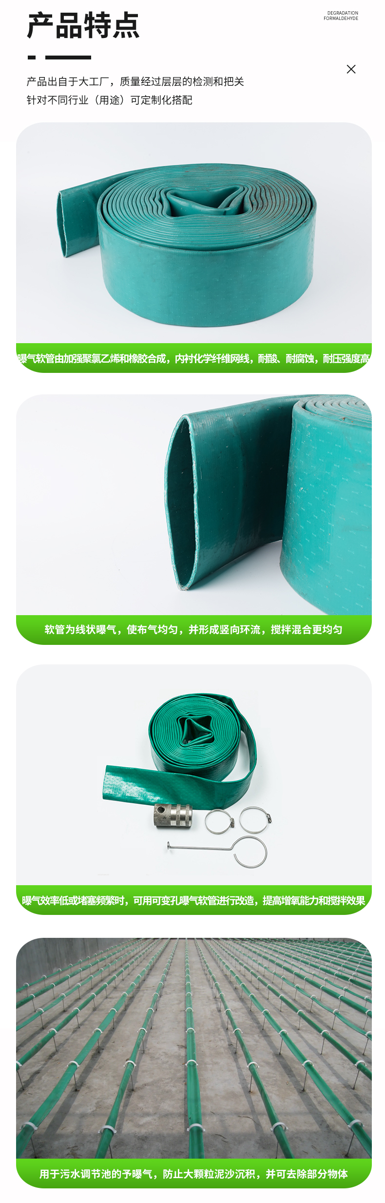 曝氣軟管是引進(jìn)西德技術(shù)開(kāi)發(fā)成功的新型增氧曝氣器。薄壁、直通道極大降低了曝氣阻力損失;可變孔及狹縫自動(dòng)開(kāi)閉,徹底解決了曝氣器的堵塞問(wèn)題;軟管為線狀曝氣,使布?xì)饩鶆,并形成豎向環(huán)流,攪拌混合更均勻;氣泡小,氧利用率和動(dòng)力效率高。