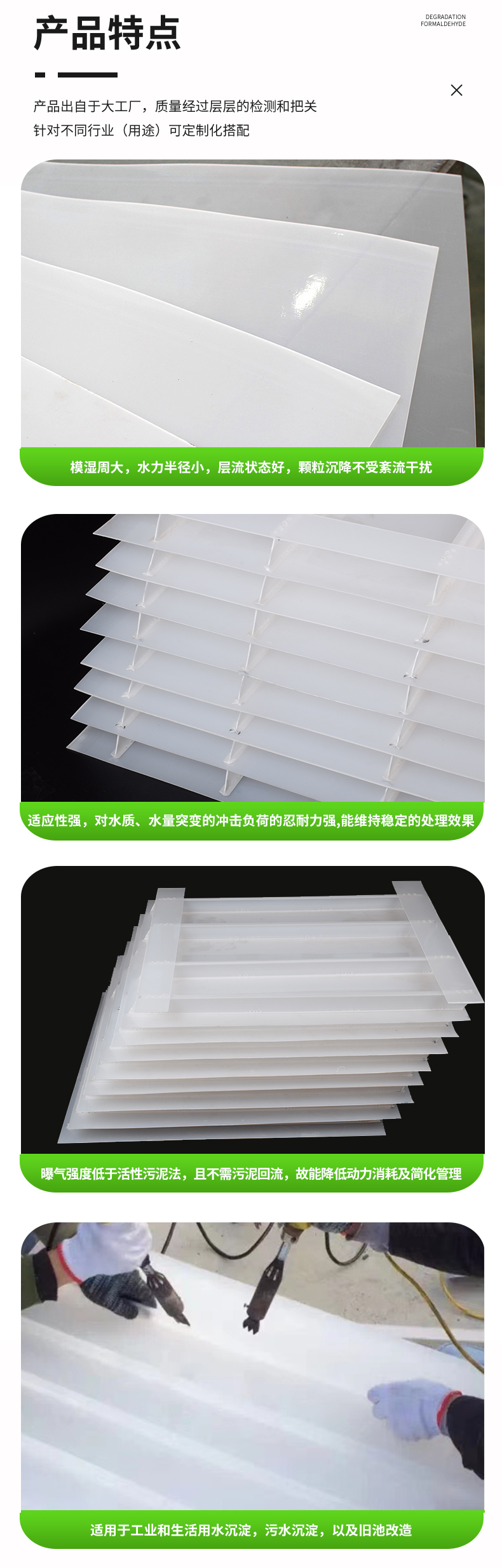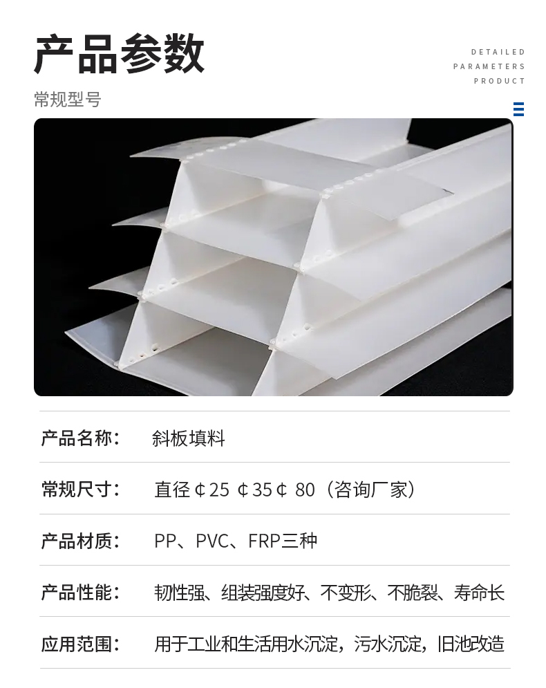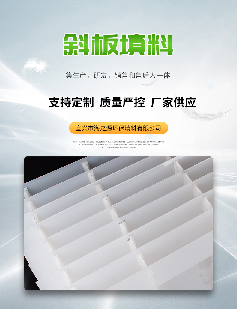 斜板填料、乙丙共聚斜板填料、小間距斜板填料主要由乙丙共聚材料加工制成。在淺層理論的基礎(chǔ)上,在斜板上部設(shè)置沉淀距離合理的沉淀段,在下部控制斜板的幾何形狀,使斜板下部形成穩(wěn)定的接觸絮凝段,通過接觸作用和淺池沉淀機理達到礬花與水分離的目的。